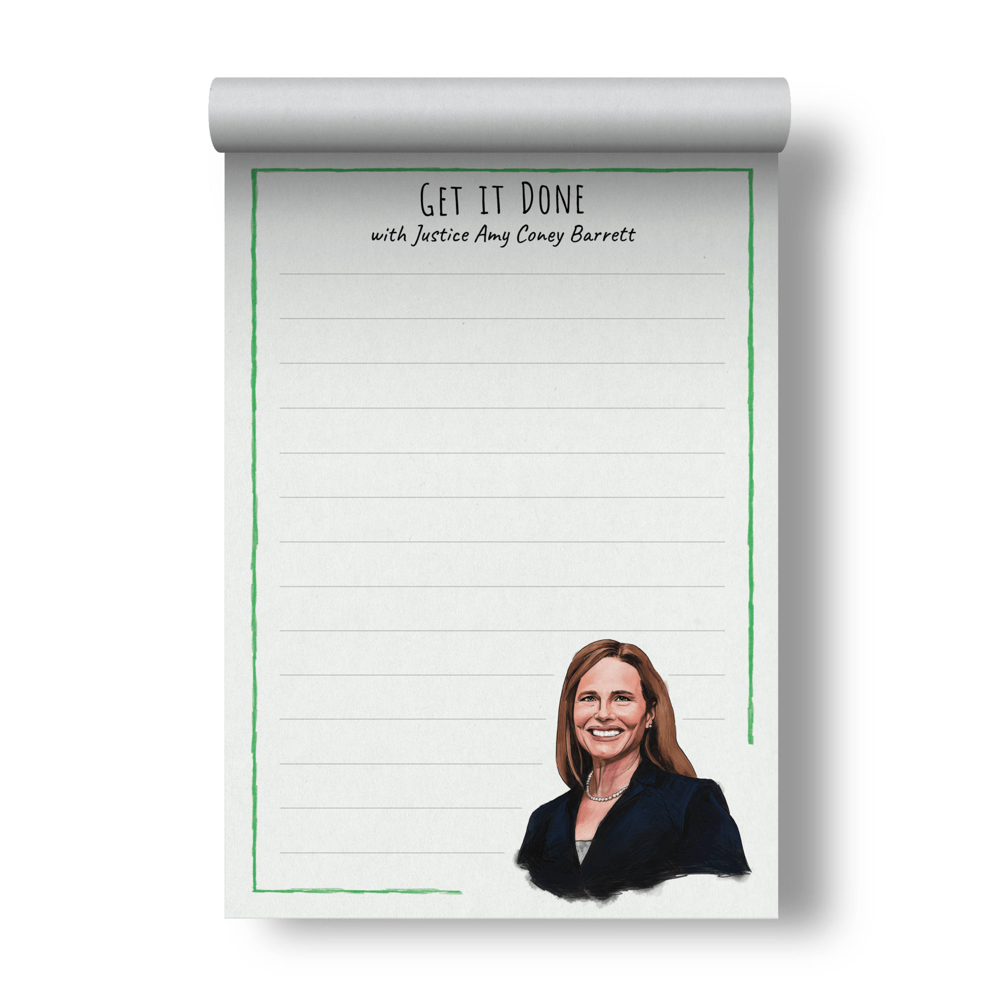 Channel your determination and efficiency with our 'Get it Done' notepad featuring a hand-drawn design of Justice Amy Coney Barrett, a symbol of strength and diligence. * 5x7 inch notepad * 50 sheets