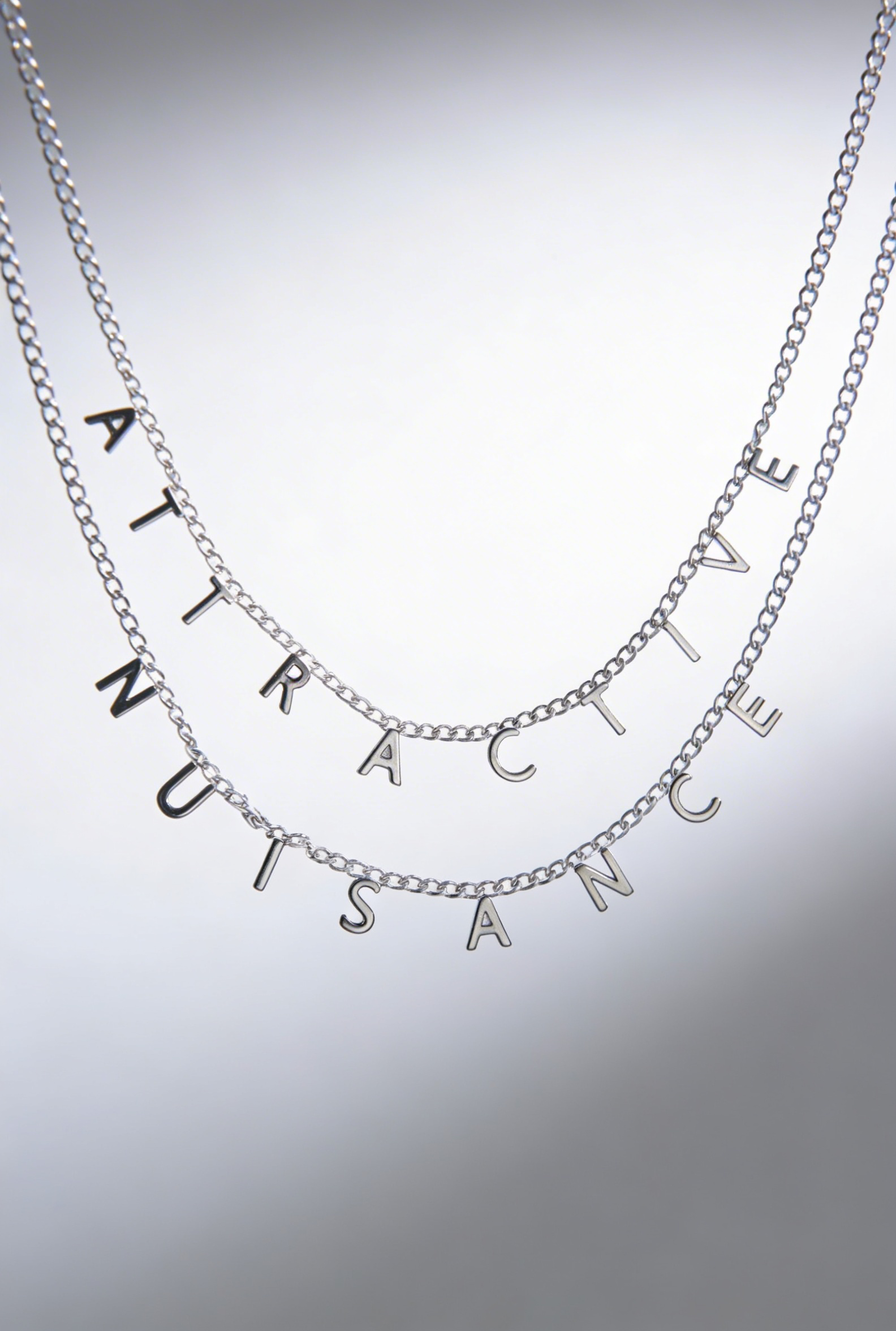 Bold, clever, and unapologetically eye-catching—just like its name. The Attractive Nuisance Necklace is a double-layered design that spells it out in gold-tone letters across two chains.