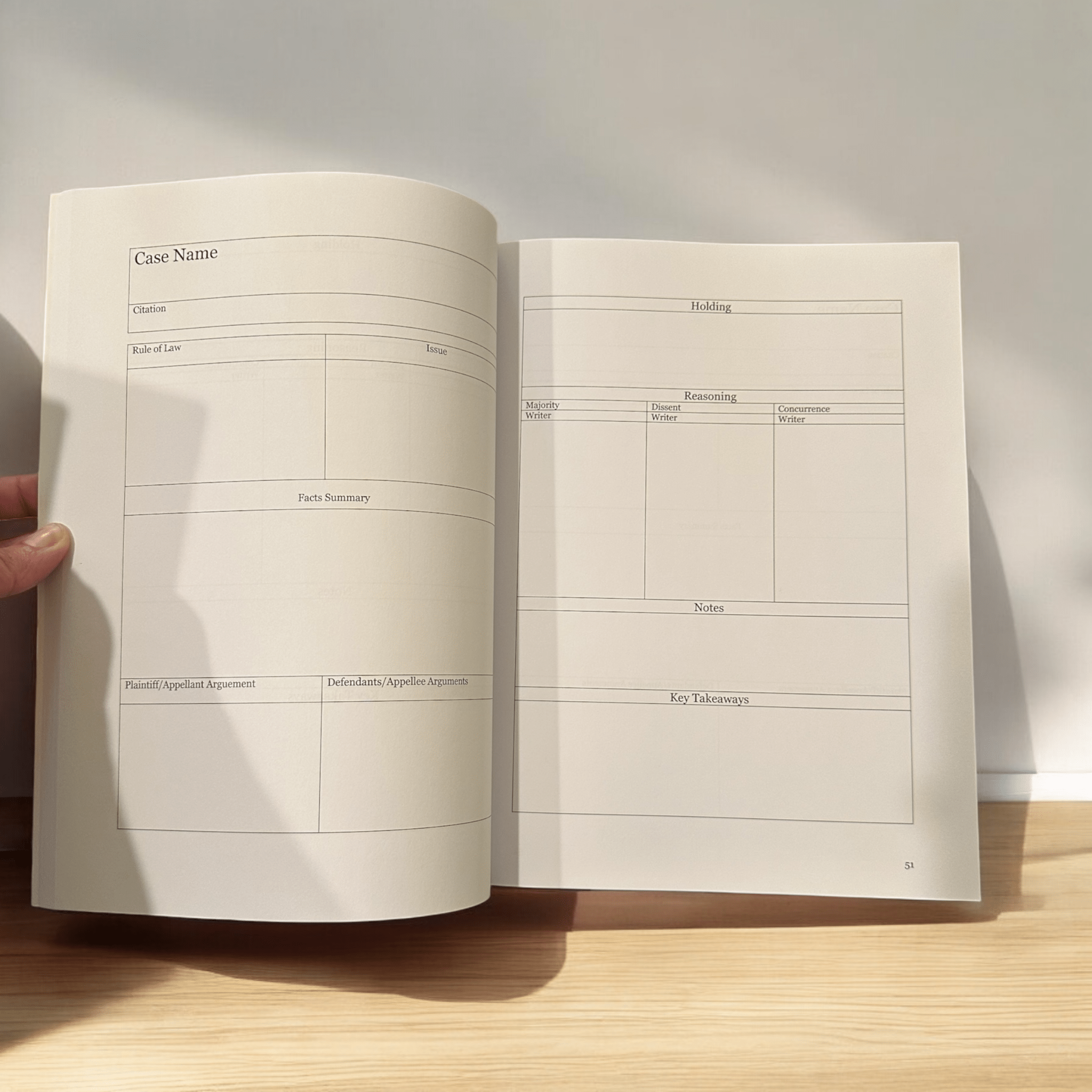 Introducing the Case Brief Notebook – your essential tool for staying organized and on top of your legal studies. Designed specifically for law students and legal professionals, this notebook provides dedicated sections for case names, rules of law, class details, and key takeaways, ensuring you capture every critical detail in one place. With a built-in table of contents, easily track your cases by page number for quick reference during exams or class discussions. Whether you're briefing landmark cases or prepping for moot court, this notebook keeps your notes clear, concise, and accessible. Perfect for on-the-go legal minds who value efficiency and structure. Includes 5 pages for the table of contents which includes space for rule statements and 100 case briefs