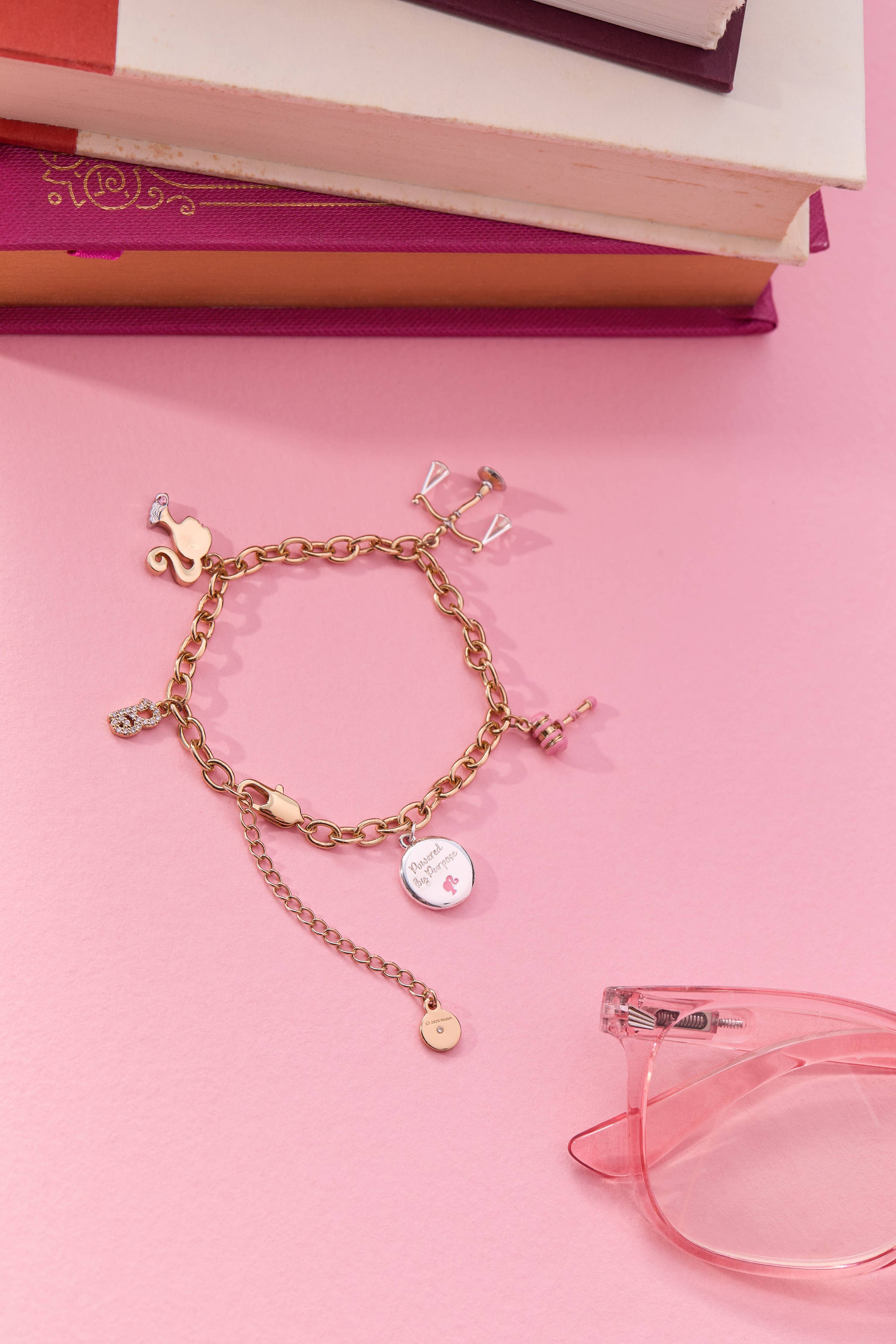 Celebrate empowerment and ambition with this stunning Barbie™ Legal Charm Bracelet, a perfect gift for the leader in your life. This beautifully crafted bracelet features an inspiring collection of dimensional charms that tell a story of strength and purpose. Admire the striking pink enamel gavel symbolizing justice, the sparkling pave Barbie "B" logo charm representing iconic style, and the meaningful mantra charm inscribed with "powered by purpose" to inspire daily. The two-tone scale charm and elegant two-tone judge silhouette complete this sophisticated design, all strung together on a classic chain bracelet. Whether you're treating yourself or surprising someone special, this piece captures the spirit of breaking barriers and pursuing your dreams with confidence and grace.